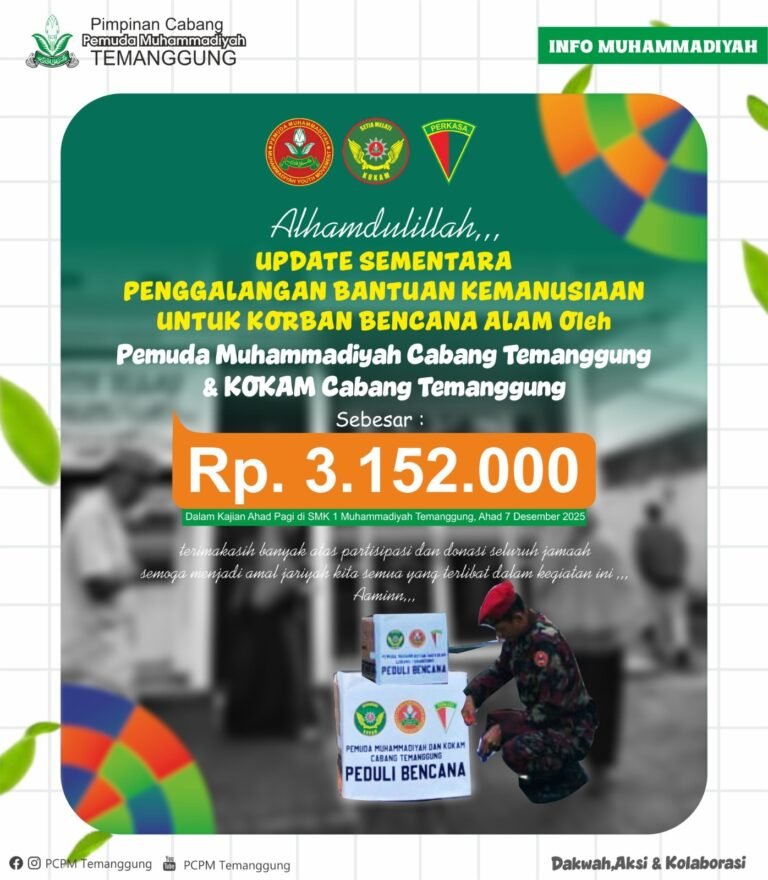 Temanggung, 7 Desember 2025 — Alhamdulillah, kegiatan penggalangan bantuan kemanusiaan untuk korban bencana alam yang dilakukan oleh Pemuda Muhammadiyah Cabang Temanggung bersama KOKAM Cabang Temanggung…