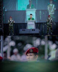 Di tengah antusiasme ribuan jamaah tersebut, tampak pemandangan yang berbeda di beberapa titik strategis. Barisan baret merah dengan seragam loreng khas Komando Kesiapsiagaan Angkatan Muda Muhammadiyah (KOKAM) berdiri tegap, sigap memantau situasi. Di antara pasukan pengaman tersebut, personel KOKAM dari Pimpinan Cabang Pemuda Muhammadiyah (PCPM) Temanggung hadir dengan kekuatan penuh, mengambil peran ganda yang krusial: turut memeriahkan syiar sekaligus menjadi garda terdepan dalam mengamankan jalannya acara.